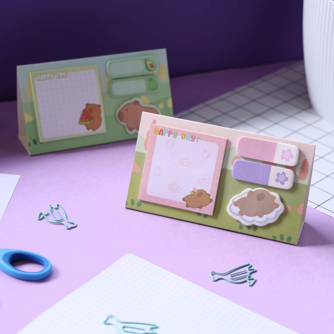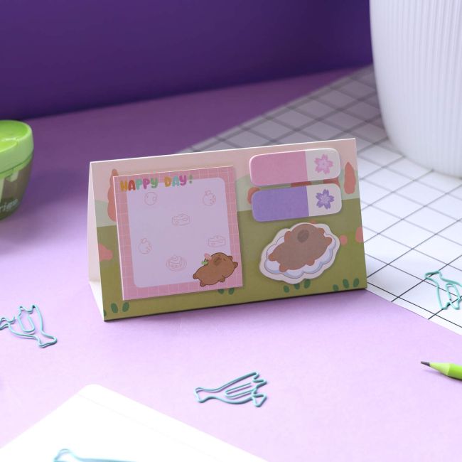 Ten zestaw karteczek samoprzylepnych STRIGO z serii Kapibara wprowadzi na Twoje biurko radość i porządek – a dzięki specjalnej konstrukcji możesz go wygodnie postawić!