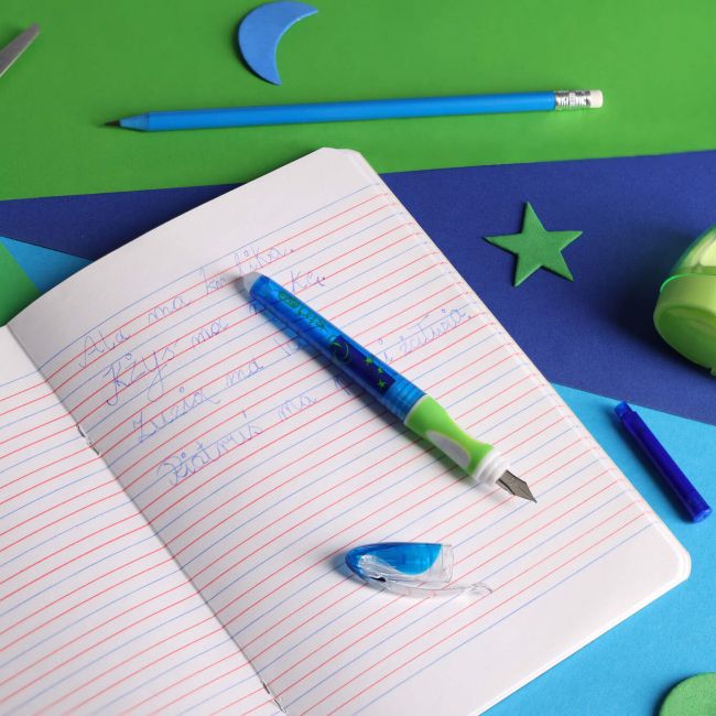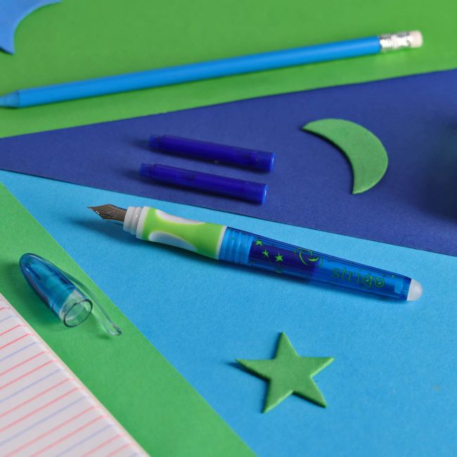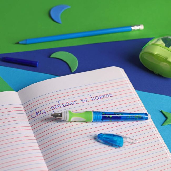 Pierwsze wymazywalne pióro ze stalówką marki Strigo z kolekcji Kosmos to idealny wybór dla dzieci uczących się pisać.