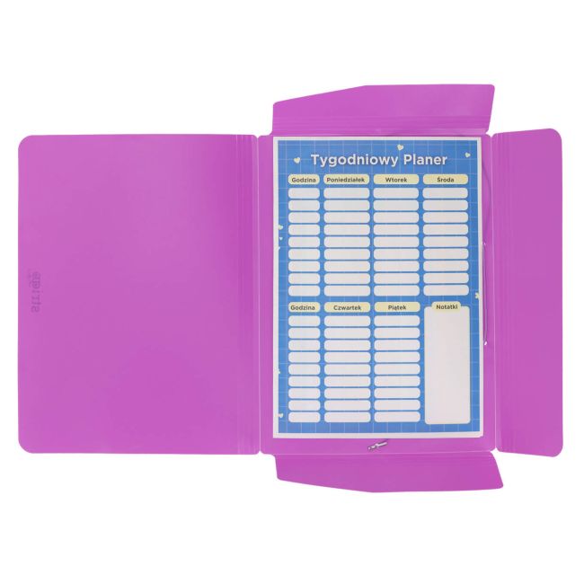 Odkryj poziomą teczkę A4 w kolorze neonowym fioltowym, idealną do przechowywania dokumentów w biurze, szkole i w domu.