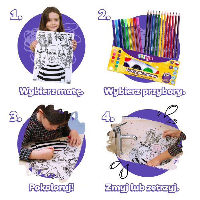 Wodoodporne Maty wielokrotnego użytku "Strigo Funny Mat" to nie tylko zwykłe podkładki. Wykonane z polipropylenu i w pełni nietoksyczne, są one specjalnie zaprojektowane, aby przynosić radość i korzyści edukacyjne.