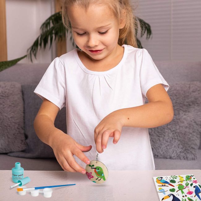 Zestaw Strigo jest pełen atrakcyjnych elementów, które rozwijają wyobraźnię i dostarczają radości z tworzenia. W komplecie znajdują się – serwetki ze wzorami, klej, drewniane zawieszki, elementy kolczyków, biała farba, pędzelek, instrukcja wszystko, co potrzebne do stworzenia własnego dzieła! Kolory, tekstury i różnorodność materiałów pobudzają kreatywność oraz stymulują zmysły.