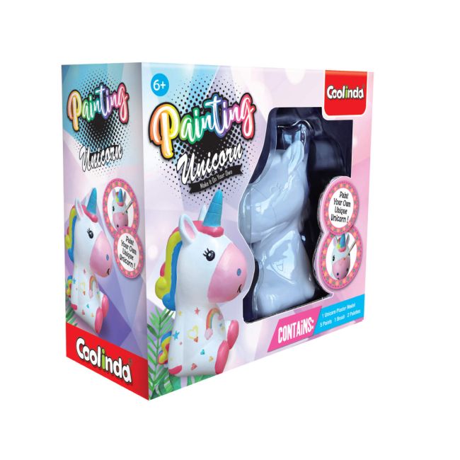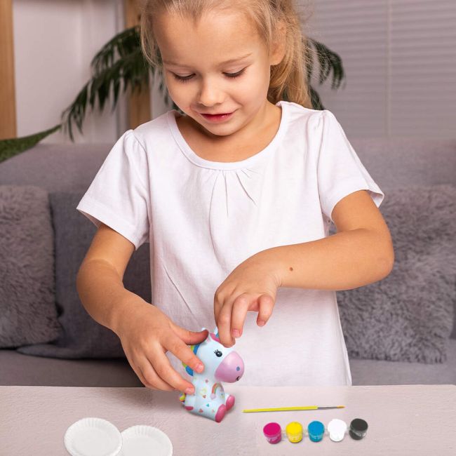 Zestaw zawiera wszystkie niezbędne elementy, by od razu zacząć twórczą zabawę: figurkę jednorożca, 5 kolorowych farbek, pędzelek i dwie paletki. Po zakończeniu malowania figurka może stać się wyjątkową ozdobą pokoju dziecka lub wspaniałym, własnoręcznie wykonanym upominkiem dla kogoś bliskiego. Ten zestaw z pewnością zachwyci każdego młodego artystę!