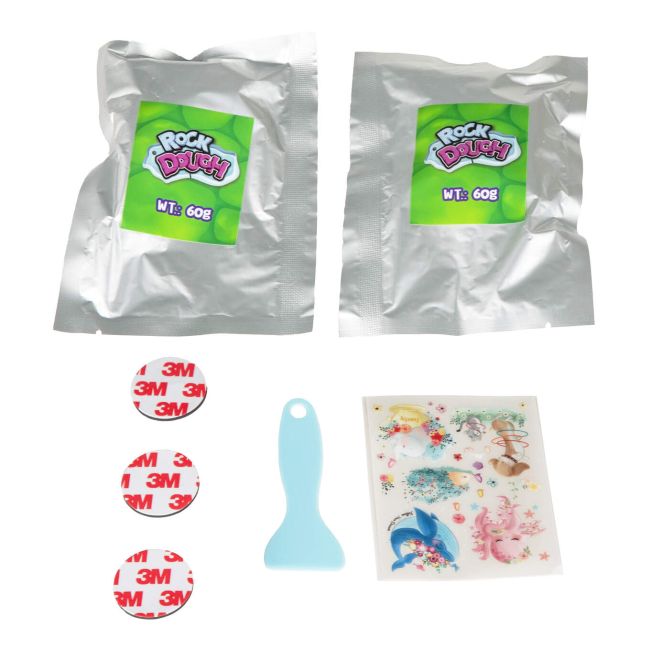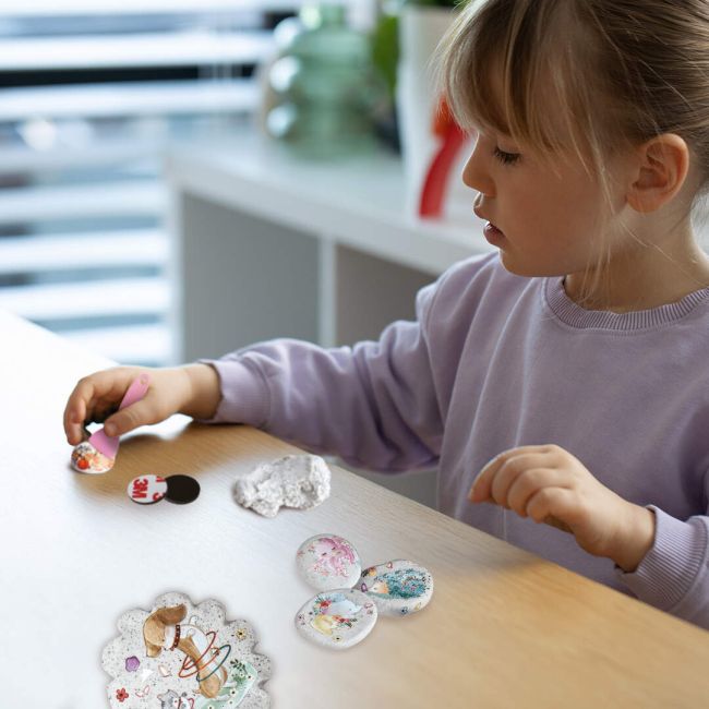 Zestaw zawiera wszystko, czego potrzeba do stworzenia pięknych, ręcznie robionych magnesów: masę kamienną, magnesy, skrobak, naklejki, a także intuicyjną instrukcję. Proces tworzenia jest w pełni bezpieczny, a rezultat pozwala dzieciom cieszyć się wyjątkowymi ozdobami wykonanymi samodzielnie – idealna zabawa dla małych artystów!